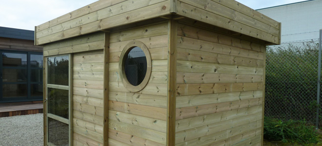 • Ossature 60 x 45mm • Bardage 17mm • Traitement autoclave • Fabrication des portes et fenêtres à tenons et mortaises • Quincaillerie de qualité, serrure à cylindre • Menuiseries originales et pratiques, coulissants extra larges • OEil-de-boeuf (selon modèle) • Toiture plate avec tôle Bacacier©