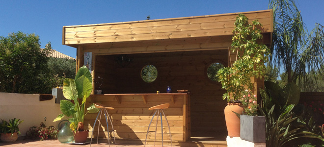 • Madriers simple rainure et languette, 28mm d’épaisseur • Assemblage à mi-bois • Non traité • Fabrication des portes et fenêtres à tenons et mortaises • OEil-de-boeuf fixe • Toiture plate recouverte d’EPDM • Sous-toiture en planchettes 17x95mm • Baguettes de finition d’angle parois et plancher • Profils U de finition en bout de madriers de parois • Poteau d’angle 12x12 avec platine réglable et cache-platine • Planche de comptoir en bois exotique massif, section 30x265